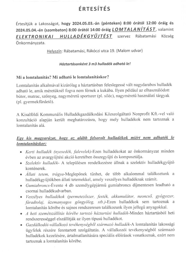 Lomtalanítás 2024. 2024.04.22. Uncategorized Bejegyzés navigáció Previous Previous post: Tájékoztatás külterületi árok rendezéssel kapcsolatbanNext Next post: Vágányzári hírdetmény